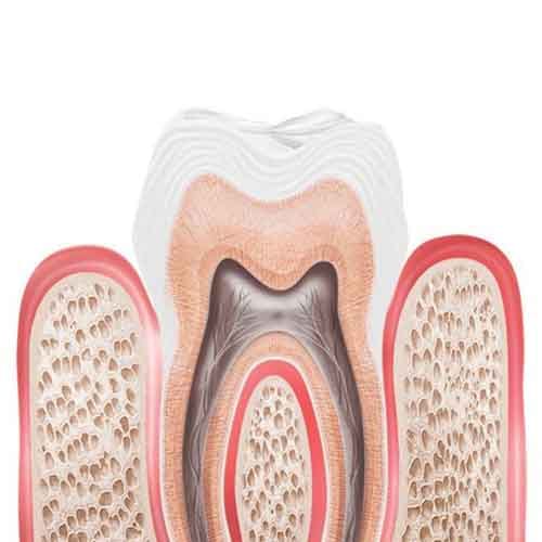 Polpa dentária: a polpa está contida dentro da câmara pulpar e do canal radicular. Esse tecido mole é composto principalmente de vasos sanguíneos e nervos.